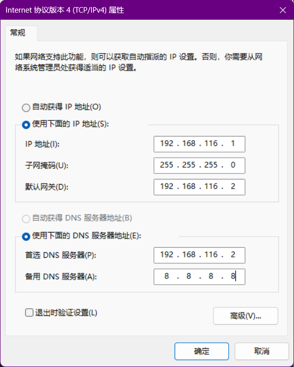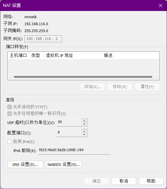 (3)查看NAT设置窗口中的网关。在NAT设置窗口,可以看到网关IP (G)192.168.116.2。
