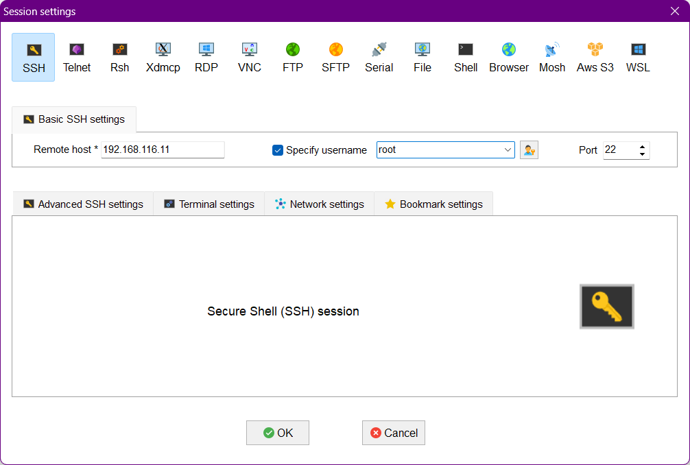 (2)点击SSH快捷按钮,打开SSH Session设置窗口,进行设置,并保存。