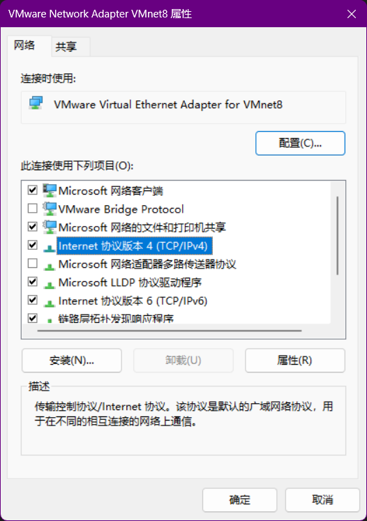 (2)选择高级网络设置,打开VMware Network Adapter VMNet8属性。
