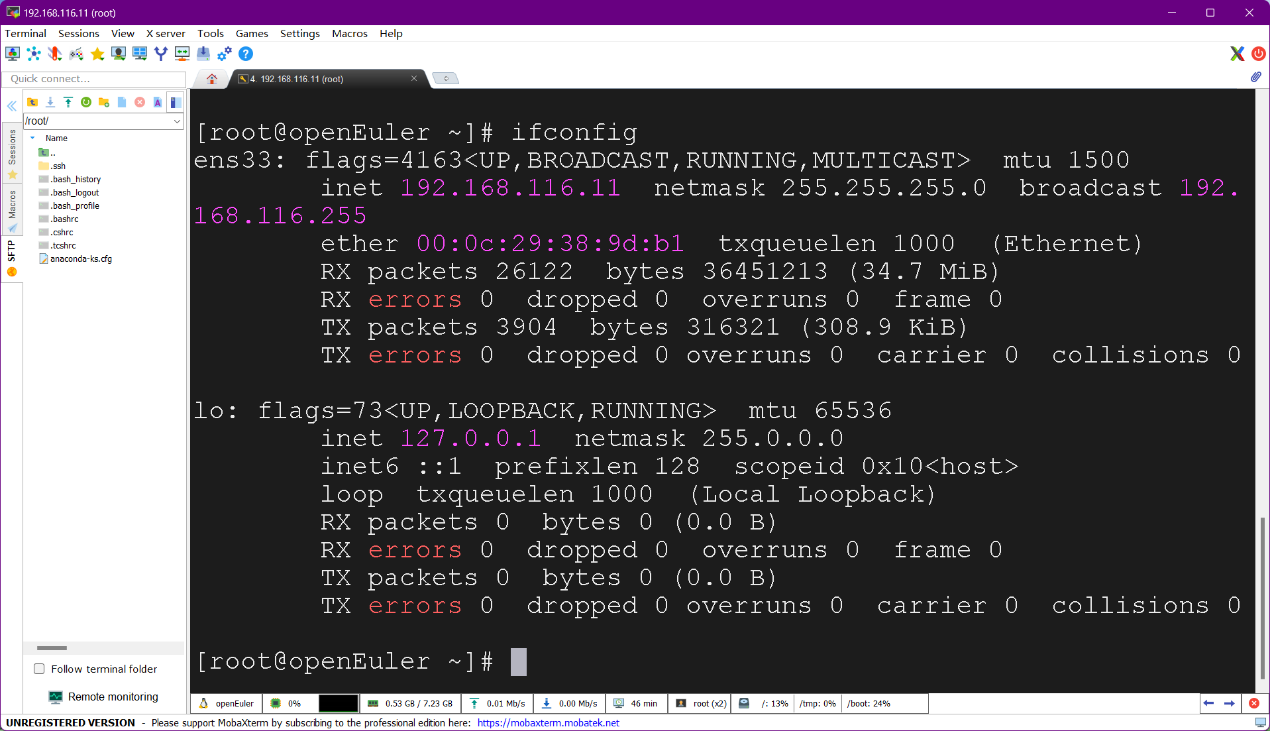 图16 root成功登录openEuler的MobaXterm命令窗口
