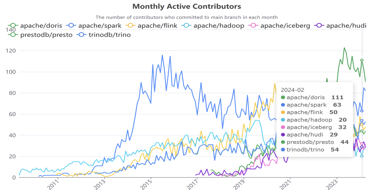 Apache Doris 是一款开源的 MPP 数据库,以其优异的分析性能著称,被各行各业广泛应用在实时数据分析、湖仓融合分析、日志与可观测性分析、湖仓构建等场景。Apache Doris 目前被 5000 多家中大型的企业深度应用在生产系统中,包含互联网、金融、制造、电信、能源、物流、政务等行业。目前项目已在 GitHub 获得超过 13000 Star,汇集 600 多名社区开发者,月度活跃贡献者数量连续数月位居全球大数据开源项目榜首,成为全球大数据领域最活跃的开源项目之一。