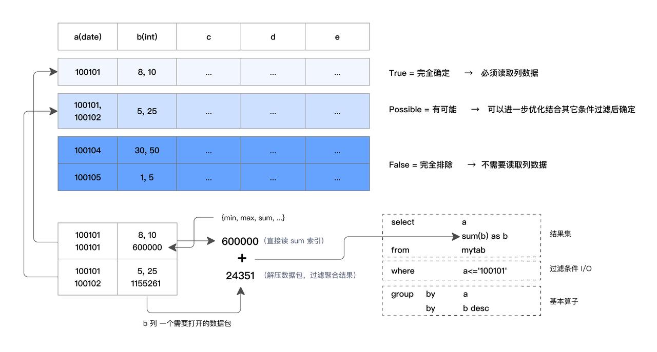 a<='100101',总共有三个数据块,第一个数据块通过读 ZoneMap 索引发现,最大值是 100101,整个数据块都满足条件,那么直接从 ZoneMap 中取得 sum 结果作为第一个数据块的聚合结果,不需要读取和解压数据块。而第三个数据块 ZoneMap 记录的最小值都不满足过滤条件,所以第三个数据块直接排除。最终只需要解压、过滤和聚合第二个数据块。