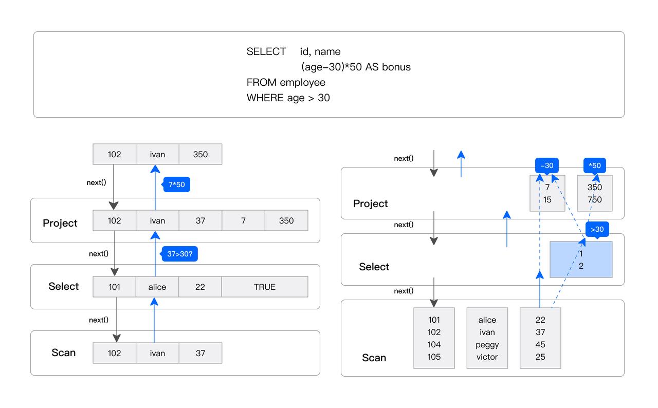 Doris & SelectDB 查询引擎是向量化引擎,所有内存结构均按列式布局。它一次处理一批数据,而非逐条处理,可显著减少虚函数调用、提高缓存命中率,并有效利用 SIMD 指令、充分采用延迟物化技术,进一步优化性能。比如下面一条 SQL ,左侧是传统的逐行处理的火山模型引擎,右侧是 Doris & SelectDB 纯向量化 + 延迟物化处理引擎,一次处理一个批量,在拼算子性能的宽表聚合场景下,向量化引擎带来的性能提升多达 5-10 倍。