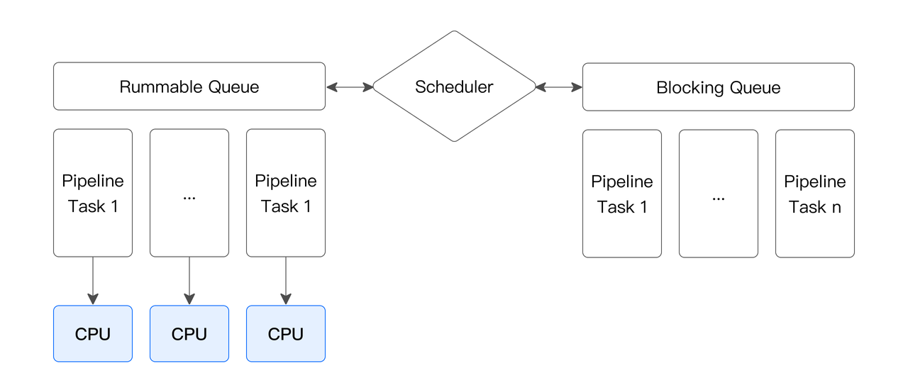 Pipeline 执行模型通过阻塞逻辑将执行计划拆解成 Pipeline Task,将 Pipeline Task 分时调度到线程池中,实现了阻塞操作的异步化,解决了 Instance 长期占用单一线程的问题。同时,可以采用不同的调度策略,实现 CPU 资源在大小查询间、不同租户间的分配,从而更加灵活地管理系统资源。Pipeline 执行模型还采用了数据池化技术,将单个数据分桶中的数据进行池化和重分布,从而解除分桶数对 Instance 数量的限制,提高其对多核系统的利用能力,同时避免了线程频繁创建和销毁的问题,提高了系统的并发性能和稳定性。
