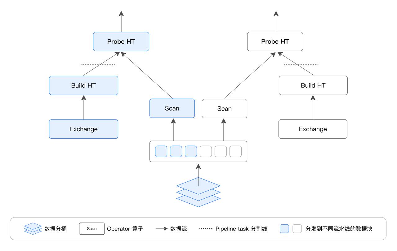 采用 Pipeline 执行机制,该技术主要通过减少阻塞,数据流驱动的方式,以高并发原理充分提高查询和数据处理的效率。其核心思想是将复杂的查询或数据处理任务分解为多个阶段或操作(称为 PipeLine Task),每个阶段负责处理数据的某个特定部分,例如过滤、投影、聚合或排序,通过并行或重叠执行这些步骤来加速整体处理过程。