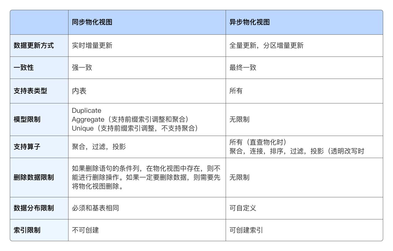 Doris & SelectDB 支持两种物化视图:同步物化视图和异步物化视图。 前者能够保持物化视图和基表数据同步一致,但只支持单表,适合单表聚合查询的分析加速。后者能够支持多表以及复杂查询,但是物化视图更新滞后于基表(两者最终一致),并支持对多表物化视图的手动刷新和按照分区级别增量自动更新。下面对其物化视图特性和适用场景的总结: