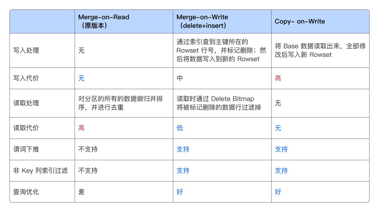 - 行列混合存储: 针对点查询需求,支持在列式存储基础上另存行存格式数据,整行数据可直接读取,减少单次点查询的随机 I/O 放大问题。