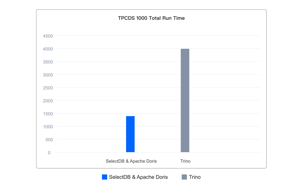 得益于上面提到的各种极速查询的技术,当使用 Doris & SelectDB 作为湖仓计算和查询引擎的时候,相比 Presto、Trino、SparkSQL、Hive 等引擎,通常有数倍的性能提升,如下所示,在基于 Iceberg 表格式的 1TB 的 TPCDS 标准测试集上,其执行 99 个查询的总体运行耗时仅为 Trino 的 1/3。