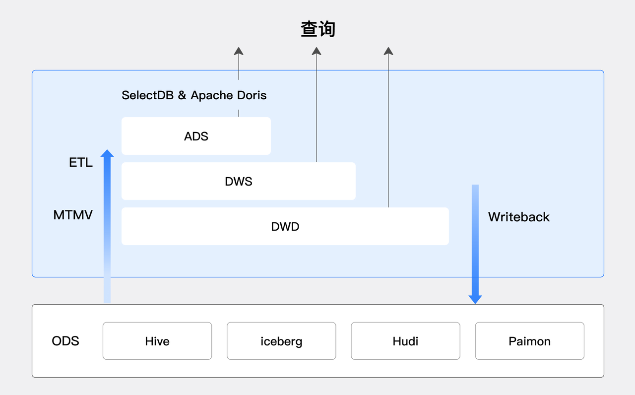 数据分层建模,ODS 层在 LakeHouse 中,DWD,DWS,ADS 层的数据加工和数据服务在 Doris & SelectDB 中,充分利用其性能优势,此外还可以将其加工好的数据再通过 Write-Back 的机制写回到 LakeHouse 中,实现备份归档或者供其他的数据系统继续处理使用。