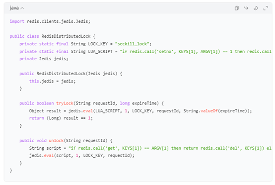 这段代码通过Lua脚本实现了分布式锁的原子性操作,避免了传统锁可能出现的问题。