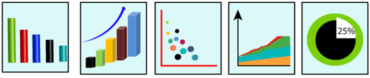 当您对一个数据集进行分析时,如果使用数据可视化的方式,那么您会很容易地确定数据集的分类模式、缺失数据、离群值等等。下图展示了五个常用的数据可视化图表: