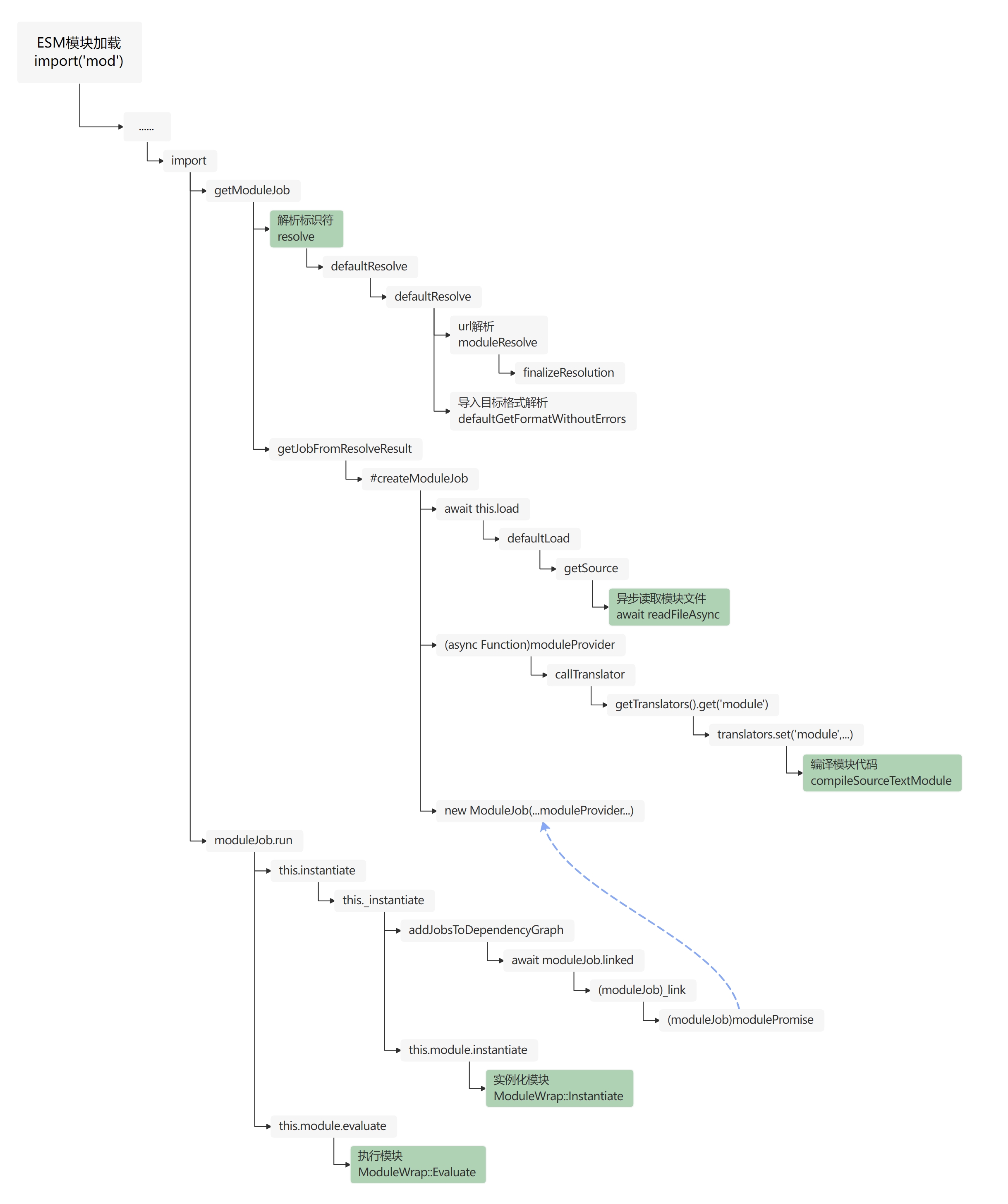 阅读源码时需要注意,esm 模块的源码使用了 Promise 高级用法:(moduleJob)modulePromise 节点使用的 moduleProvider,本质是个 async Function,也就是异步任务。这个异步任务在(async Function)moduleProvider 节点处创建,但是在 await moduleJob.linked 节点处才加入任务队列(执行)。