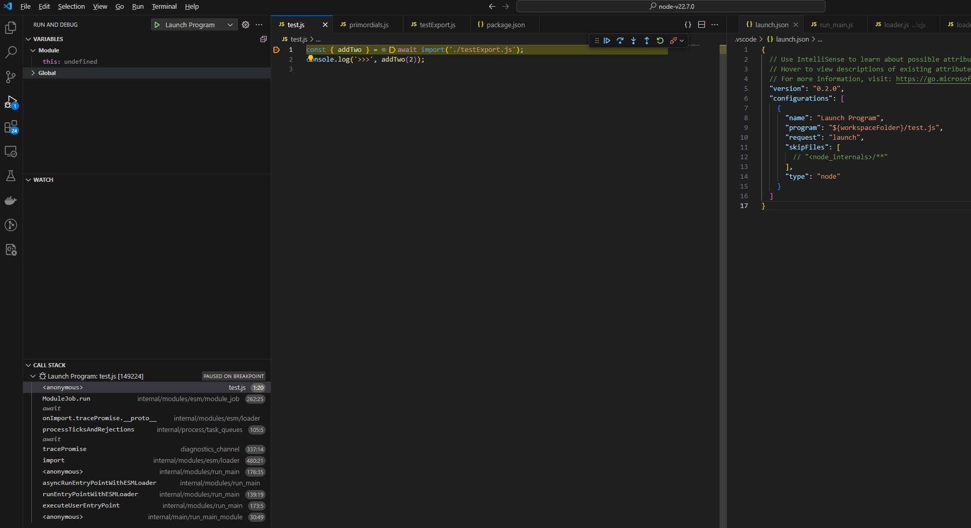 按下图配置即可开始 import() 源码调试。test.js 和 launch.js 的内容如图所示,./testExport.js文件里随便写点什么,语法能通就行。