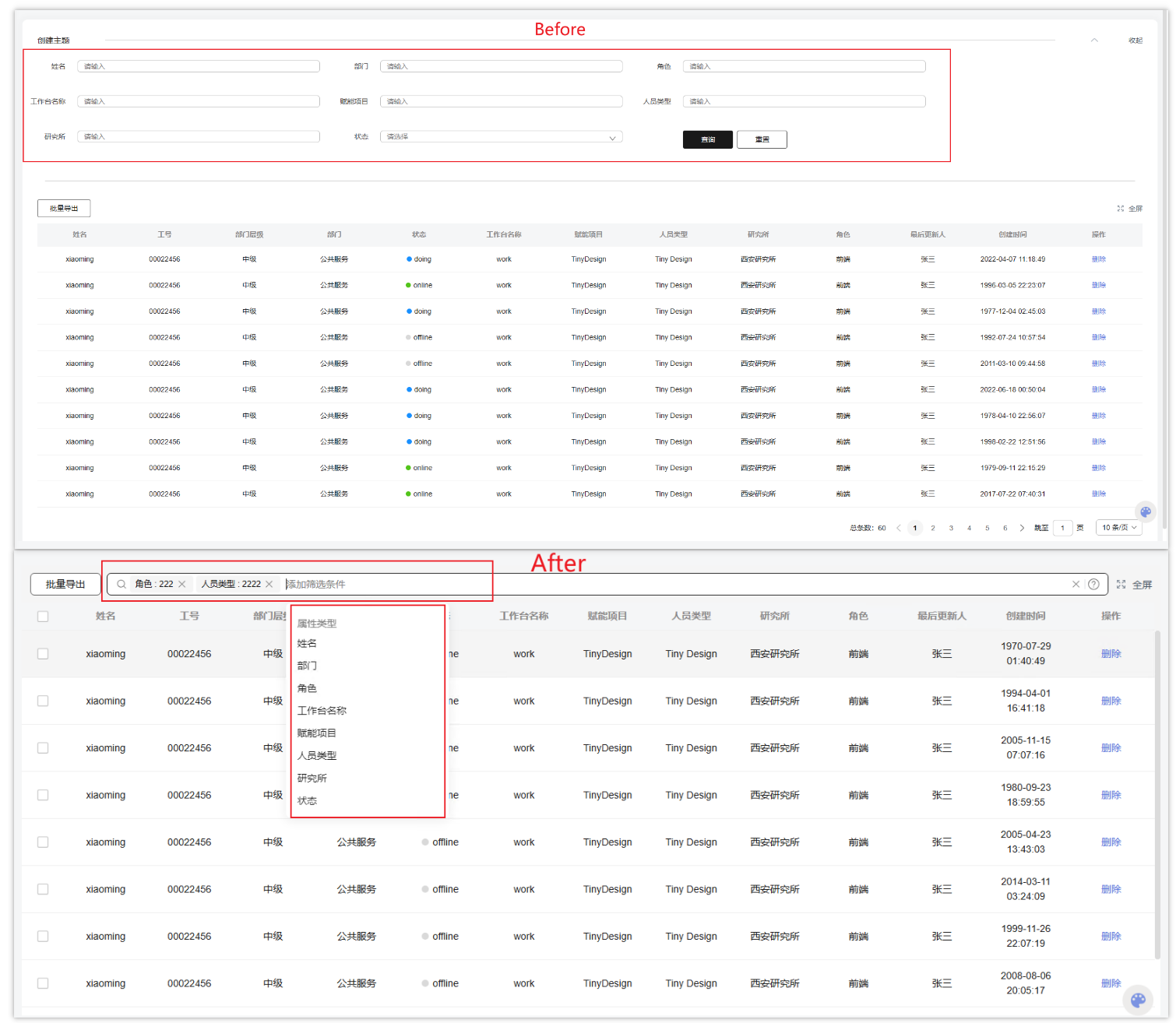 之前的列表搜索比较传统,每个筛选项是一个单独的组件,比如按姓名搜索是一个输入框,按角色搜索是一个下拉框,按日期搜索是一个日期选择框等。
