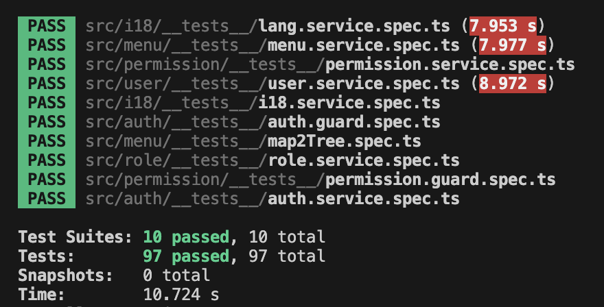 为了尽可能保障质量,给自己多一点安全感,我们给 NestJS 后端服务增加了大量单元测试,目前一共有97个单元测试(欢迎大家一起参与共建,我们的单元测试基于 Jest)。