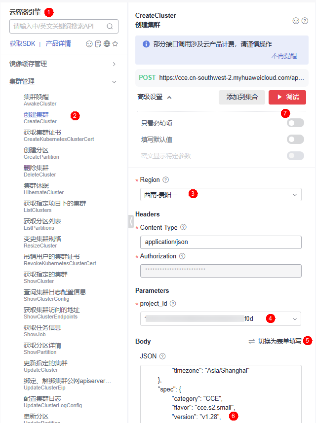 2)选择需要的“Region”,并将“Body”切换为表单填写的方式,将步骤2.1中获取的创建CCE集群请求体粘贴入“Body”栏,注意修改对应的CCE版本为“1.28”,点击“调试”。确认“调试结果”为“调试成功”后,可在CCE控制台看到创建中的CCE集群,注意如果创建的是CCE包周期集群,需先在"费用"完成订单支付,才能看到创建中的集群。