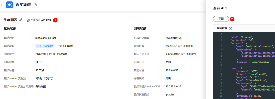 登陆CCE控制台,在“集群管理”页面单击“购买集群”,填写集群配置参数,建议“集群版本”选择“v1.31”,“插件配置”基础功能使用默认即可,不要勾选“Volcano调度器”。其余参数填写完成后,单击“下一步:确认配置”,点击“集群配置”栏“点此查看API数据”,下载创建集群的请求体。
