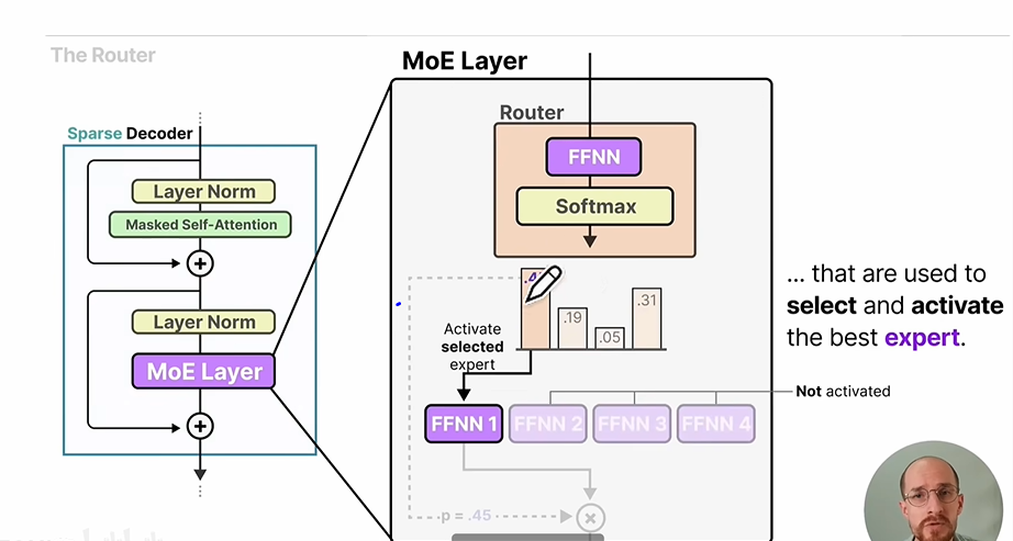 MOE是mixture of experts 的缩写,简单来说,就是把传统transformer结构中decoder层里面的单个线性层替换层多个并列的线性层。在这些线性层前面还有一个Router,Router会选择并列线性层里面的一部分进行计算。这样的话,既能让模型学习更多的知识(多个“专家”),又能减少推理计算量(选择部分“专家”进行计算)。