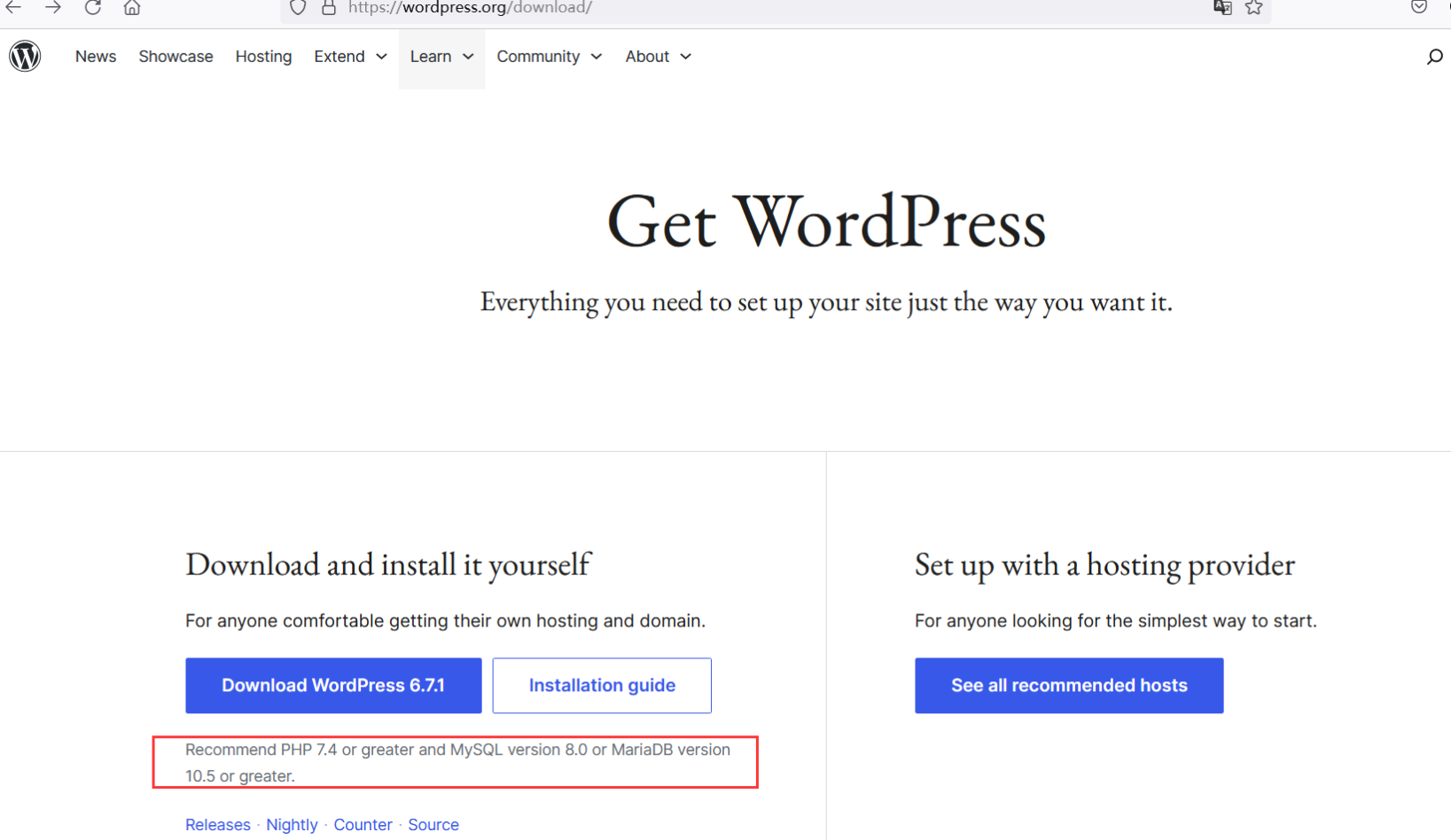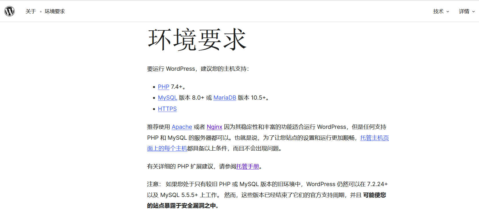 从官方建议网页中可知,虽然还是可以安装低一点版本的PHP和数据库版本,但官方提示担心各种漏洞而受到威胁,因此肯定按着官方建议,安装所要求的版本。