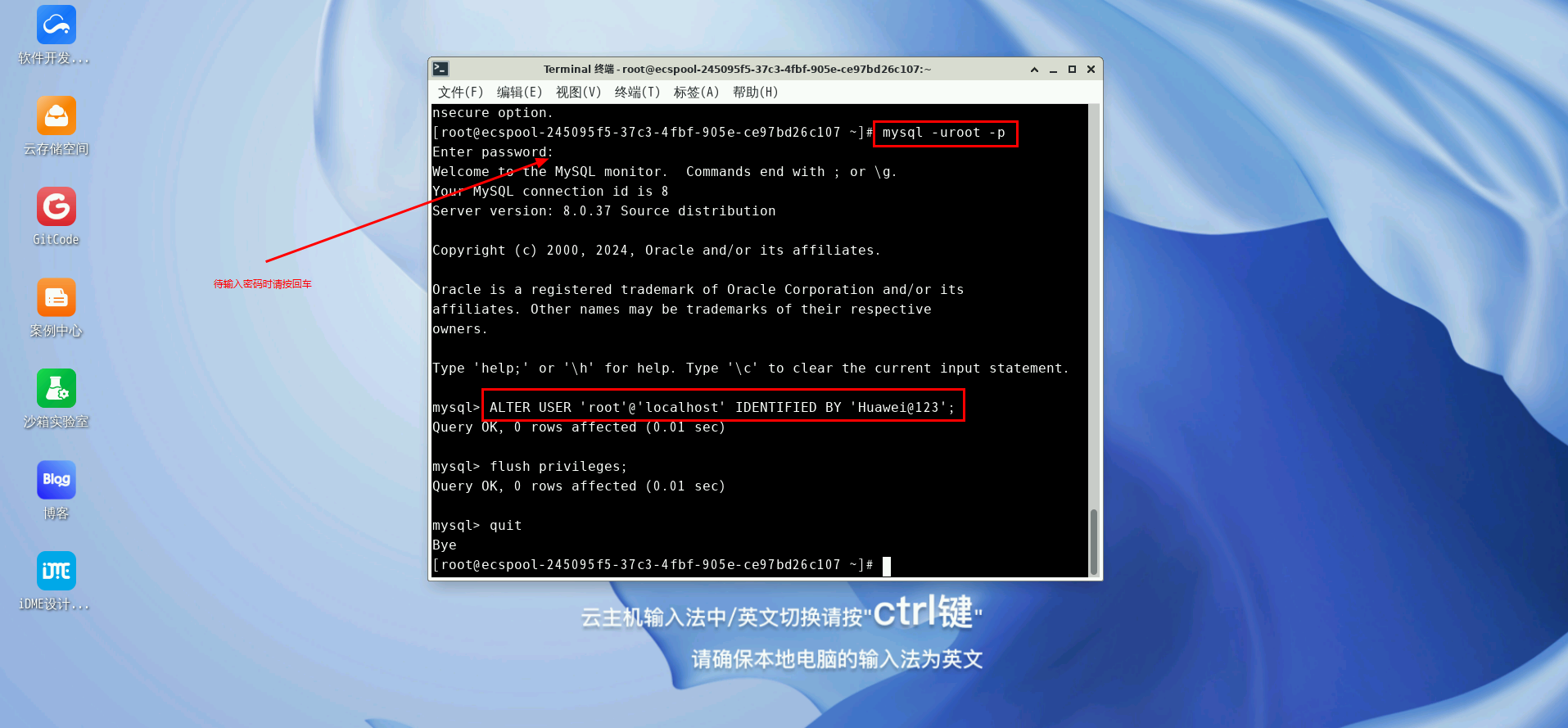 来修改数据库root账户的密码。(本案例使用Huawei@123,开发者可自定义)然后执行: