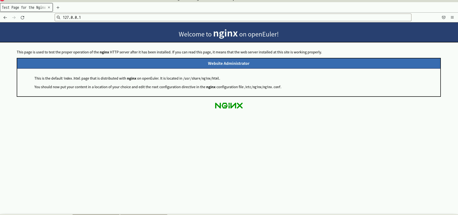 在云主机的浏览器访问地址http://127.0.0.1/,若Nginx 安装成功,则会显示如下页面。