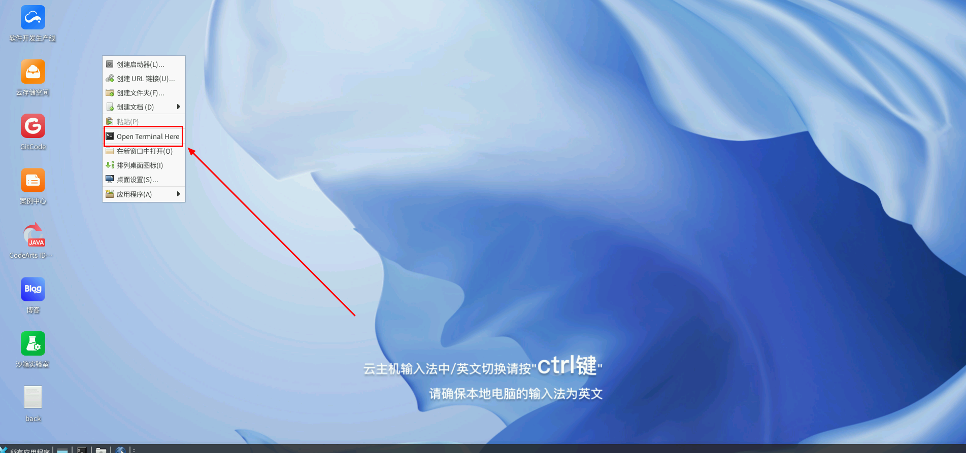 登录云主机之后,在云主机桌面单击鼠标右键,选择“Open Terminal Here”,打开终端。