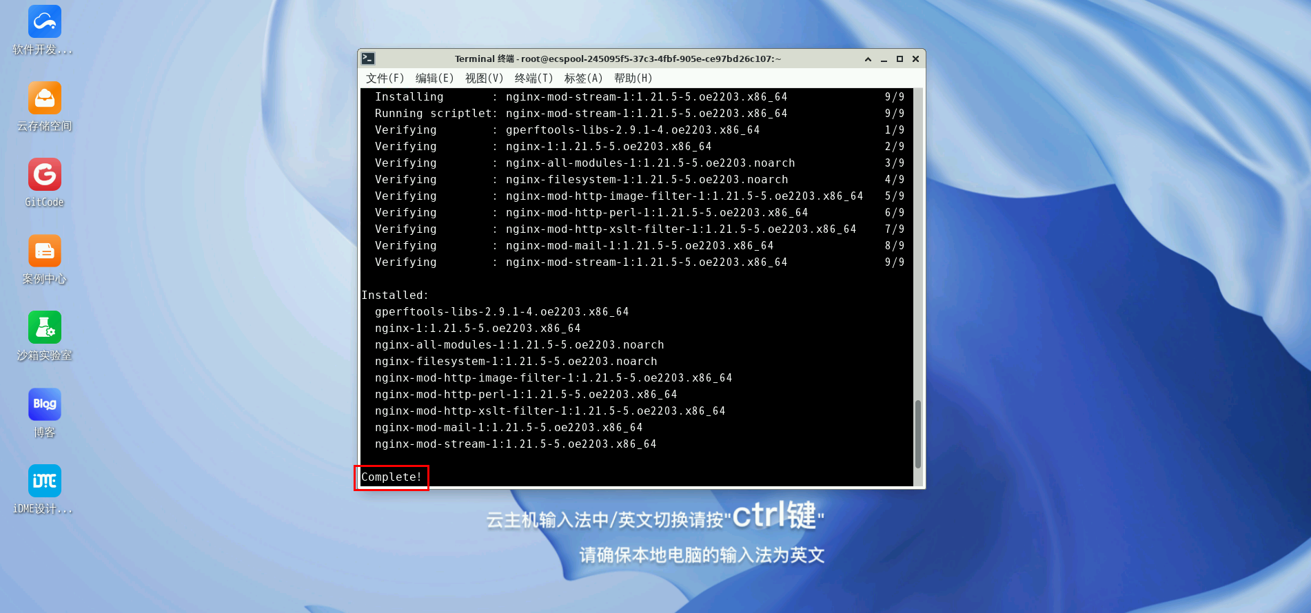 回车,进行nginx安装,待终端出现Complete表示 Nginx 安装完成。