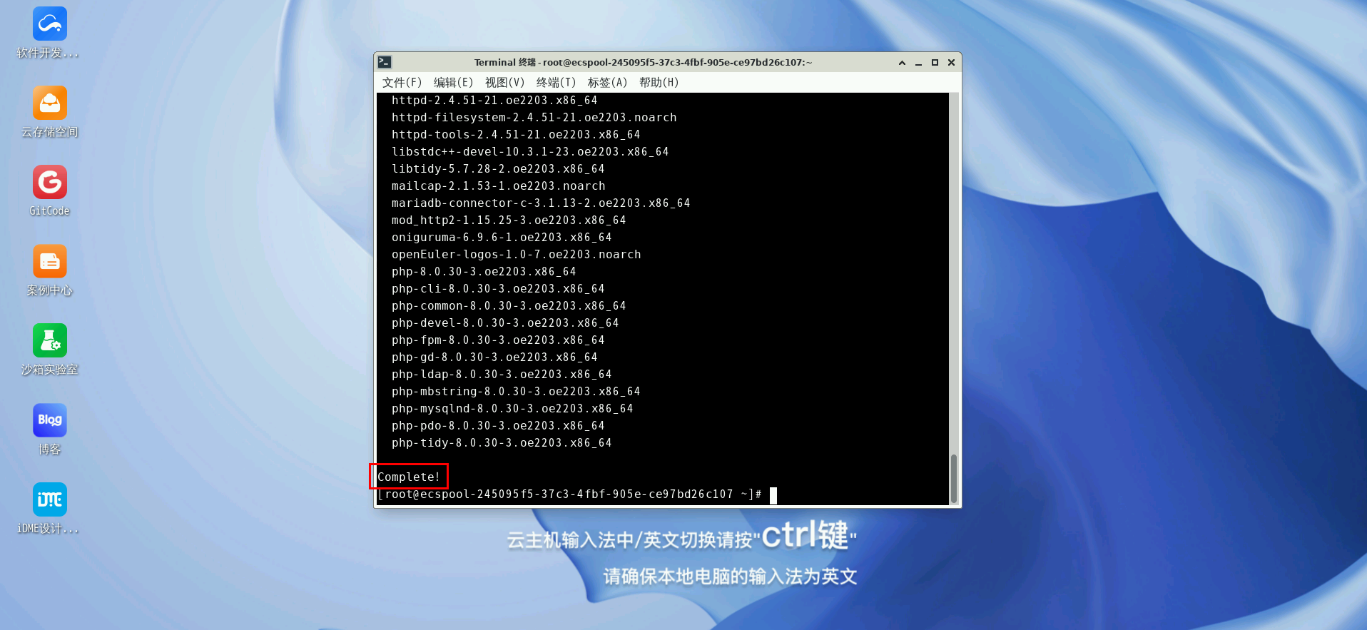 回车,待终端出现Complete表示 mysql 安装完成。
