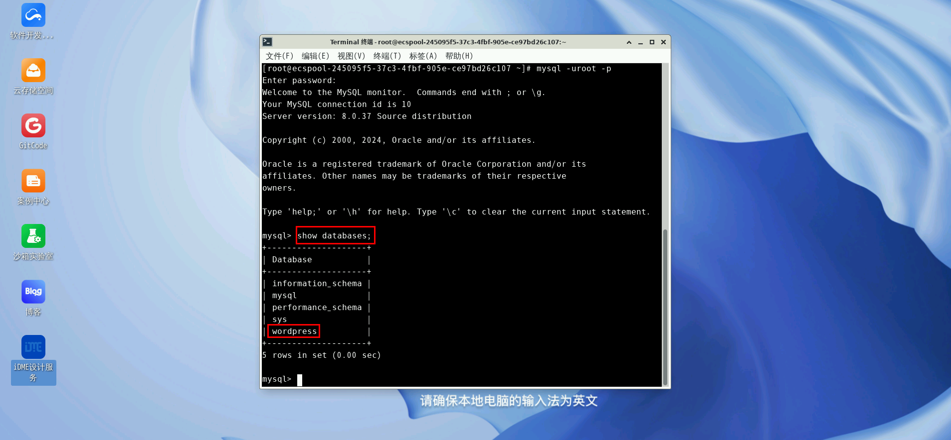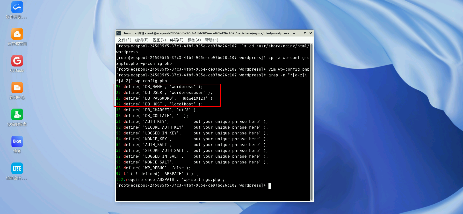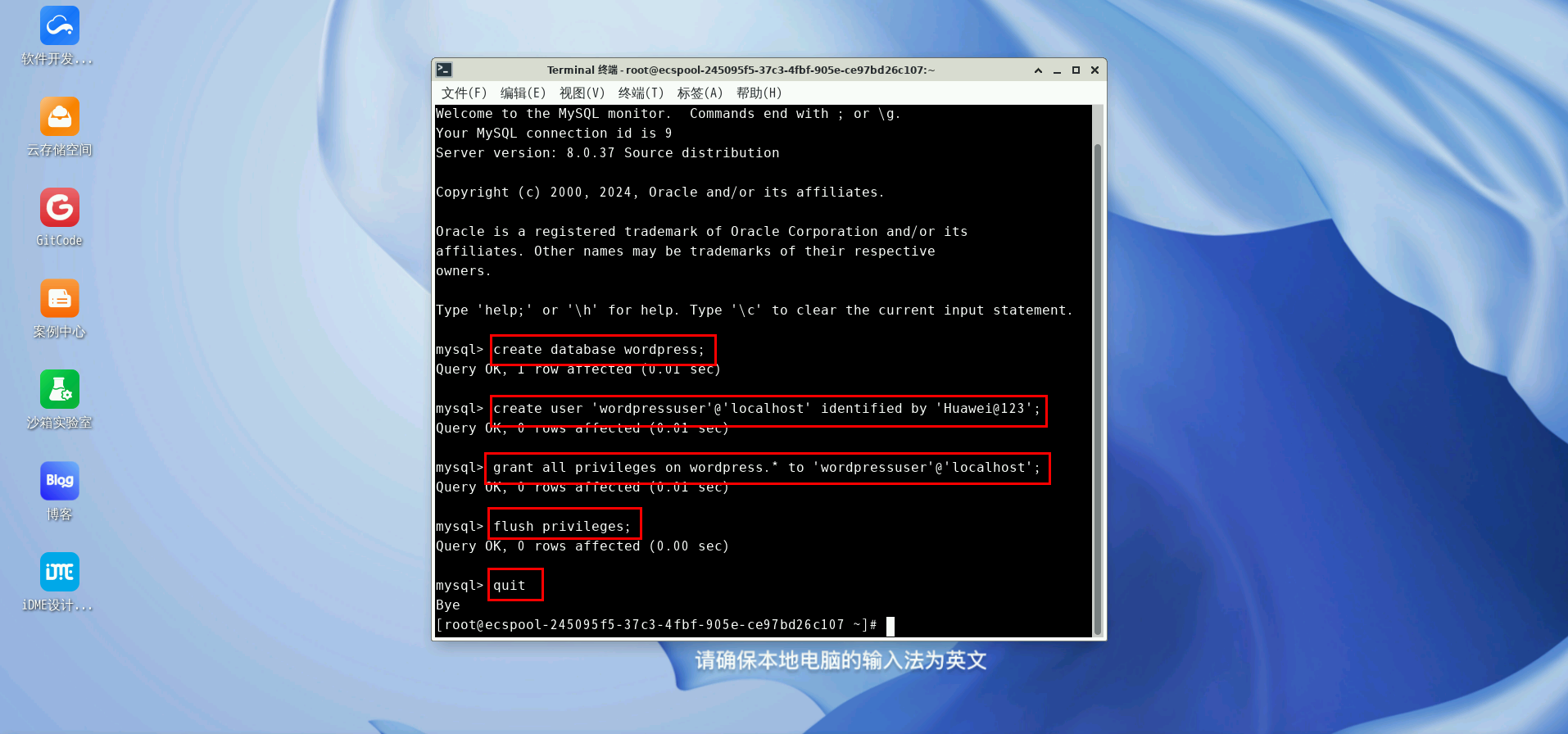 登录数据库并创建WordPress系统所用的数据库wordpress和对应的用户wordpressuser,并使用密码Huawei@123。在终端输入: