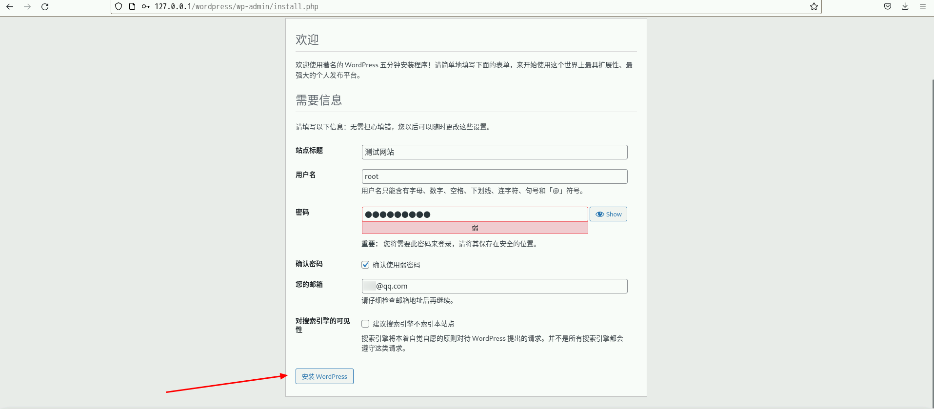 然后按照提示填写对应的表单信息后,即可点击安装WordPress。