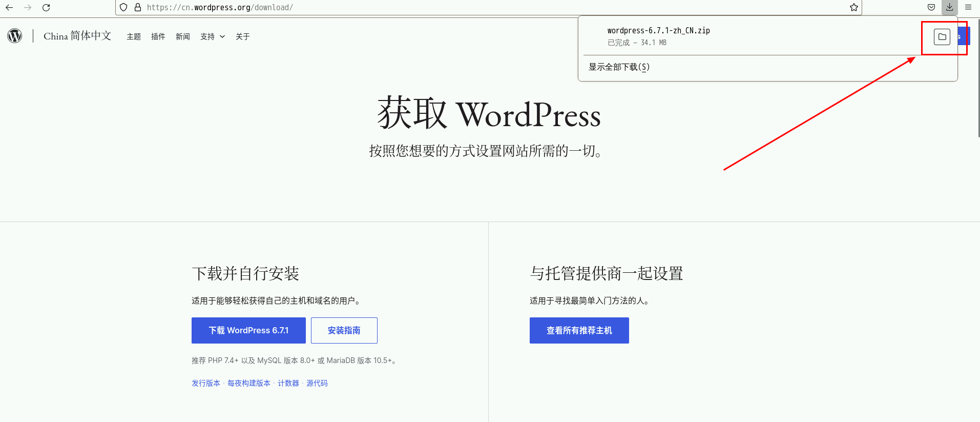 打开WordPress官网的下载页面:https://cn.wordpress.org/download/ ,下载wordpress-6.7.1软件包至本地。
