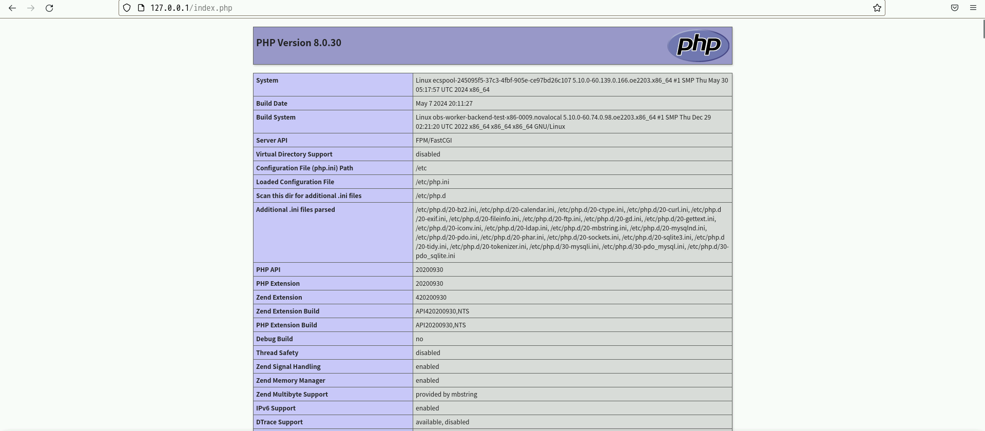 来对php服务进行重载。使用浏览器访问http://127.0.0.1/index.php,显示如下图页面,说明PHP安装成功。