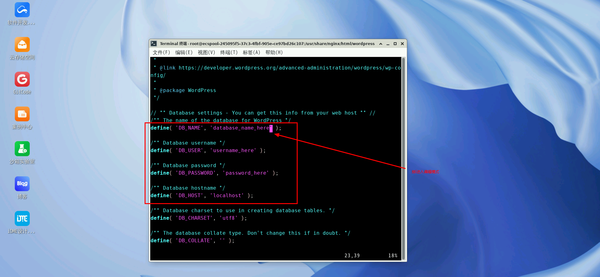 按 “i”进入编辑模式来编辑配置文件,按照下图把DB_NAME(数据库名称)、DB_USER(数据库用户名)、DB_PASSWORD(数据库密码)更改为之前所配置的设置,参数如下:
