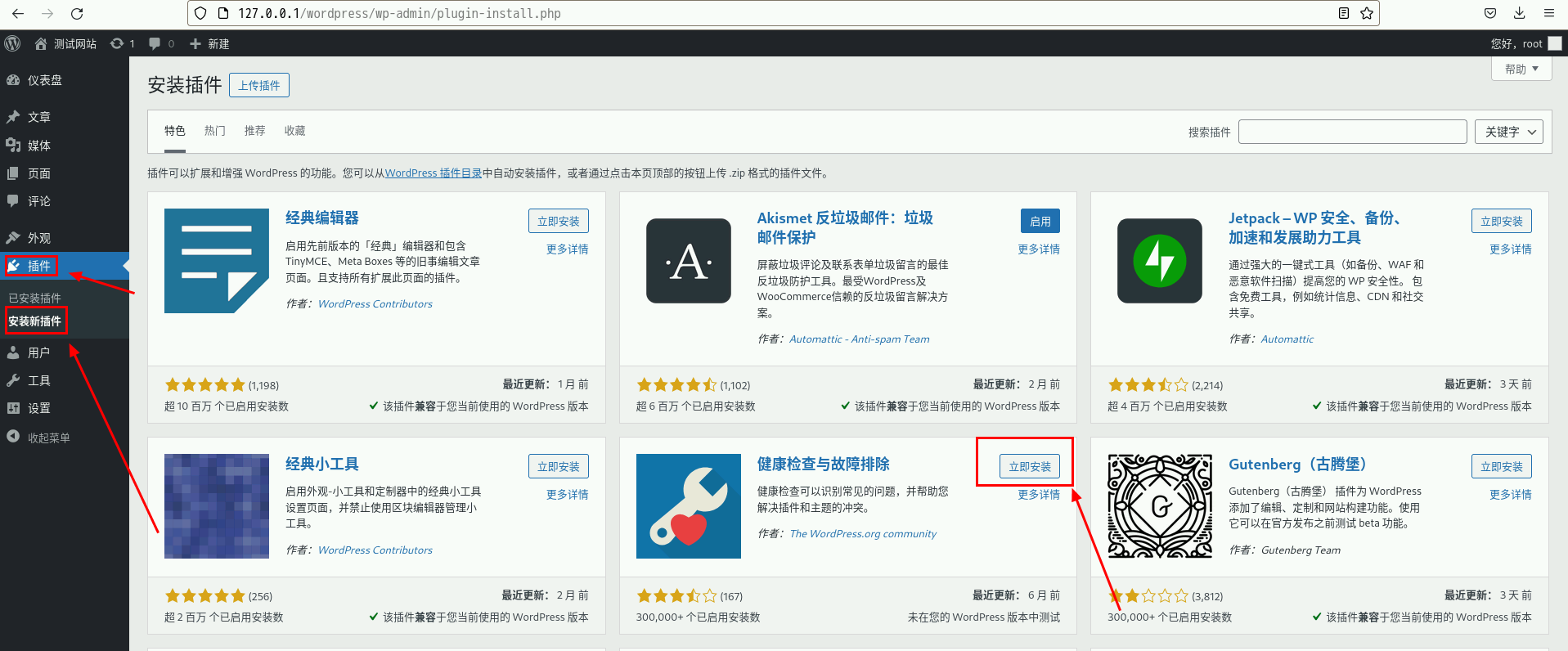 可以在管理界面选择想要的主题和插件,可使用在线安装的方式进行安装,也可以在线更新各种插件(PS:前提是设置好此前所说的访问权限,不然会弹出授权界面)。