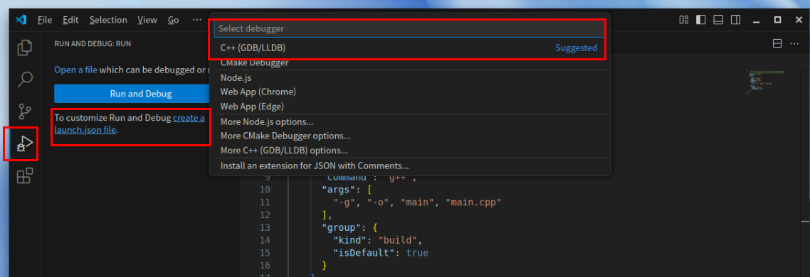 1) 点击左侧调试图标(或按 Ctrl+Shift+D),选择 Create a launch.json file → C++ (GDB/LLDB)。