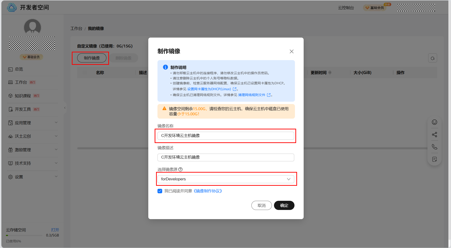点击制作镜像,设置镜像名称、镜像描述、选择镜像源。点击确定,开发者空间将自动开始制作镜像,制作镜像需要30分钟,请耐心等待。