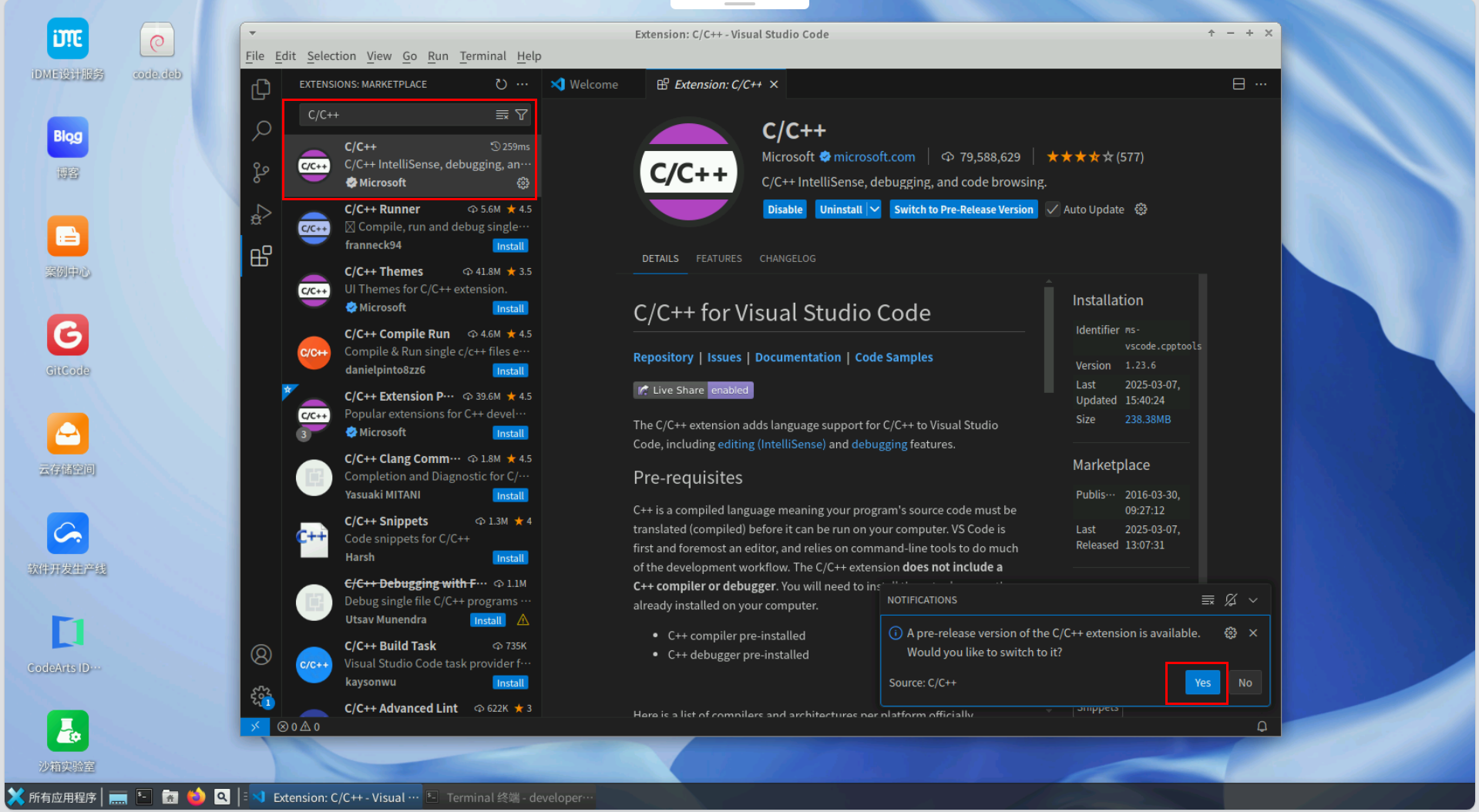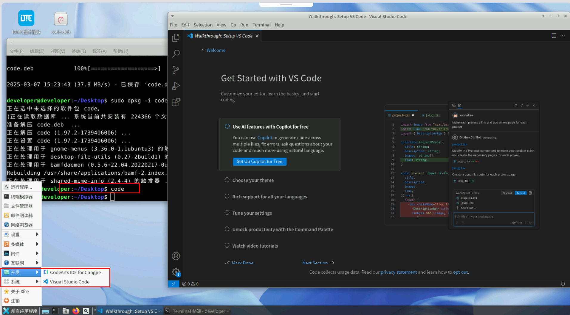 在云主机Terminal Emulator窗口,可以通过命令行下载.deb安装Visual Studio Code: