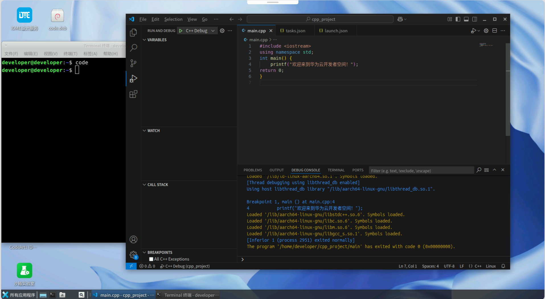 等待镜像加载(约3-5分钟),进入云桌面,Terminal Emulator窗口通过code命令启动VS Code,点击运行程序,这里显示程序运行成功。