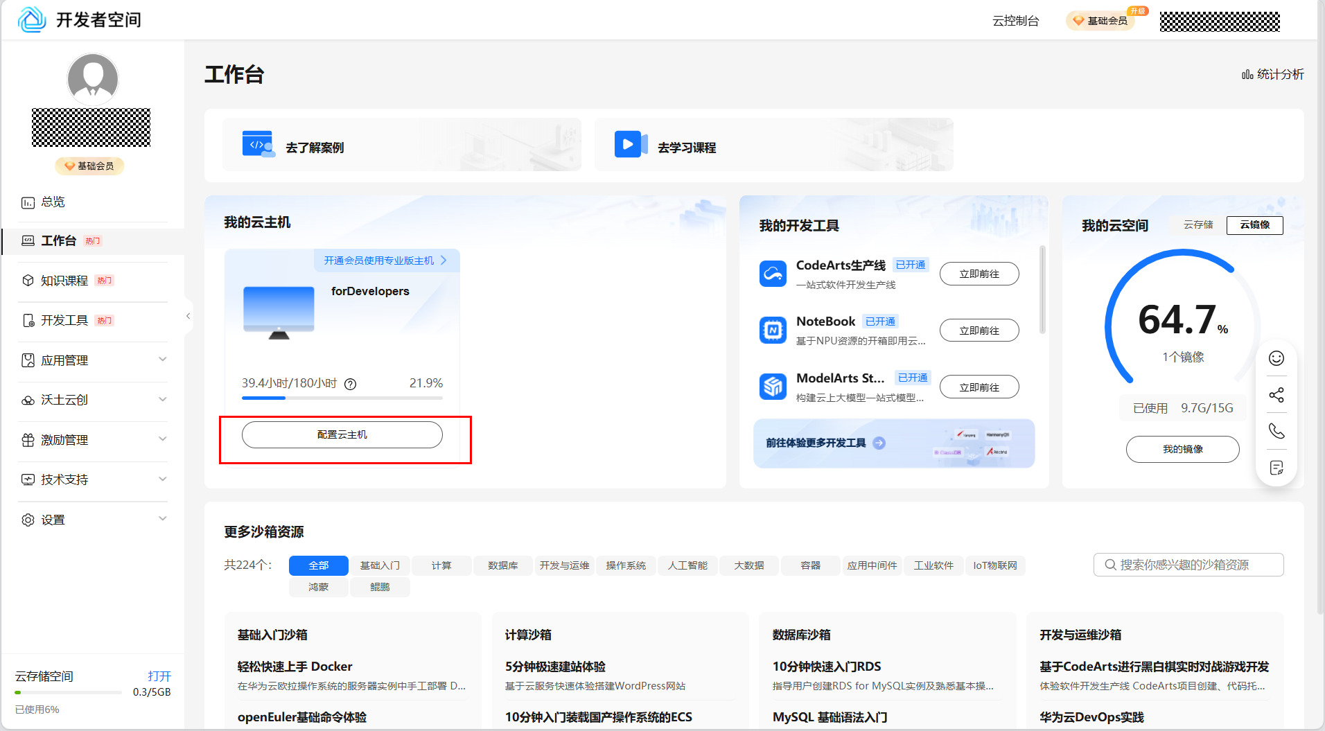 登录开发者空间,参考“10 分钟玩转云主机 ” 案例的2.2小节内容完成华为开发者空间云主机申请与配置,云主机配置参数如下: