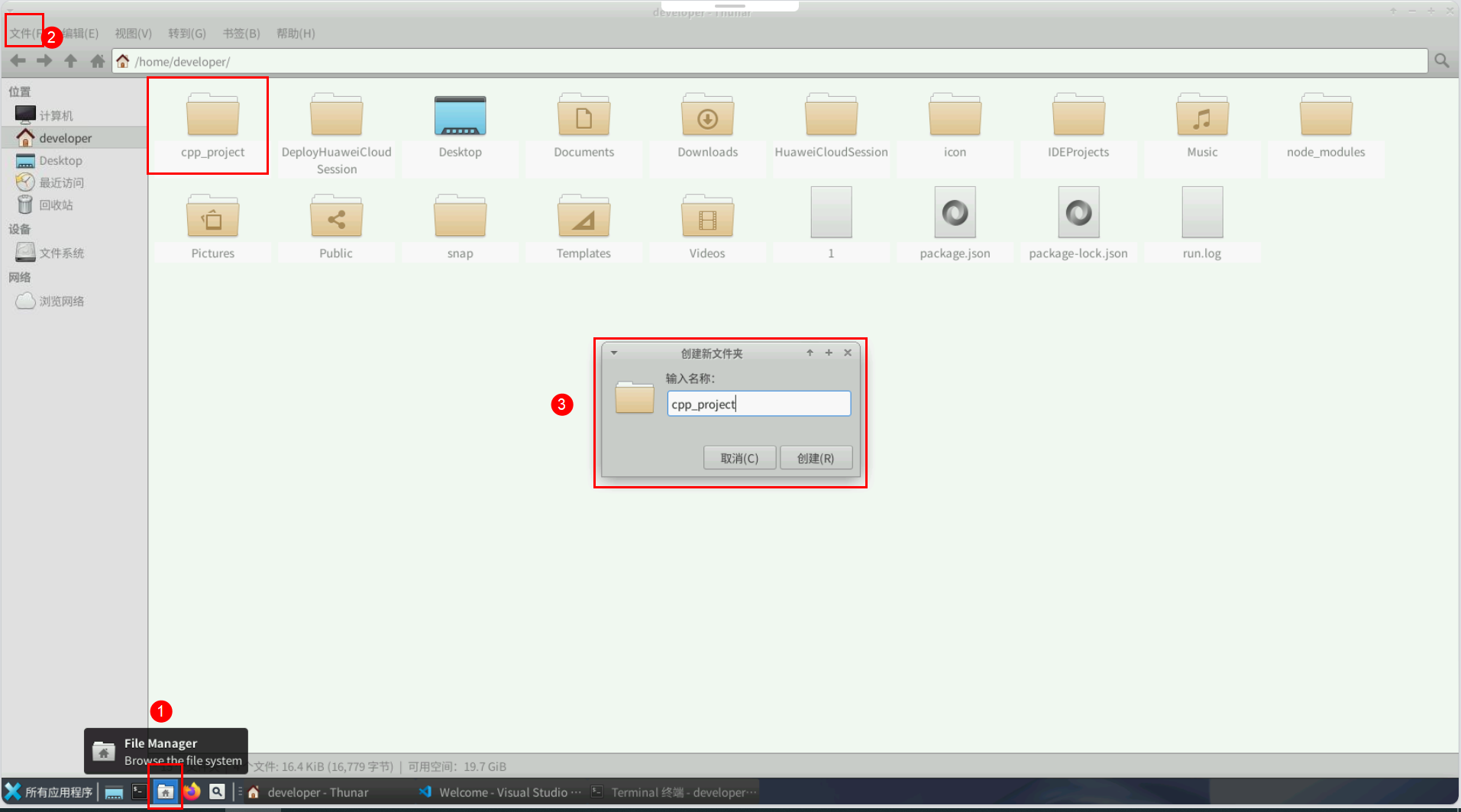 1. 在云主机左下角打开File Manager。在File Manager左上角文件 – 新建文件夹,编辑名称创建所需要的工程目录。