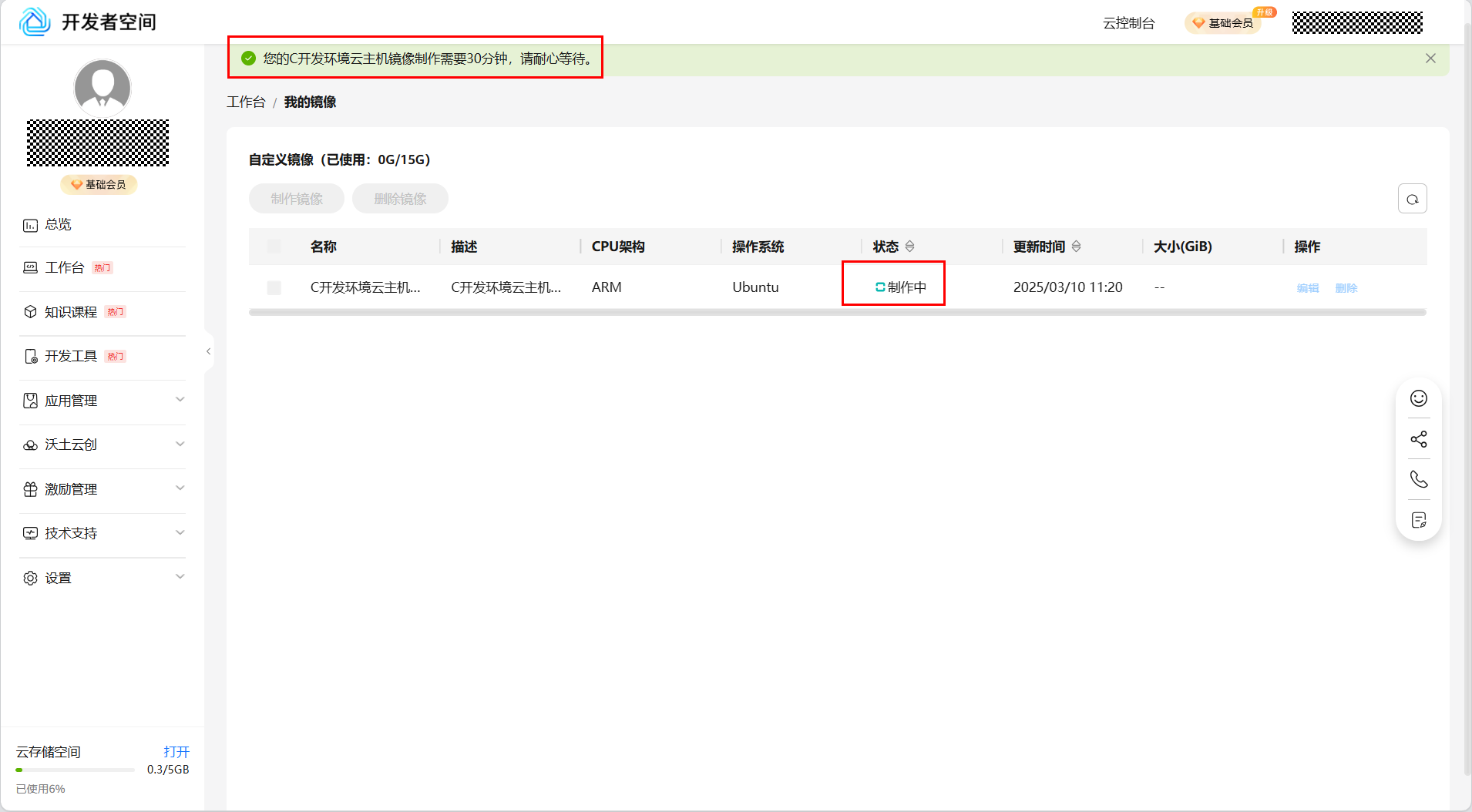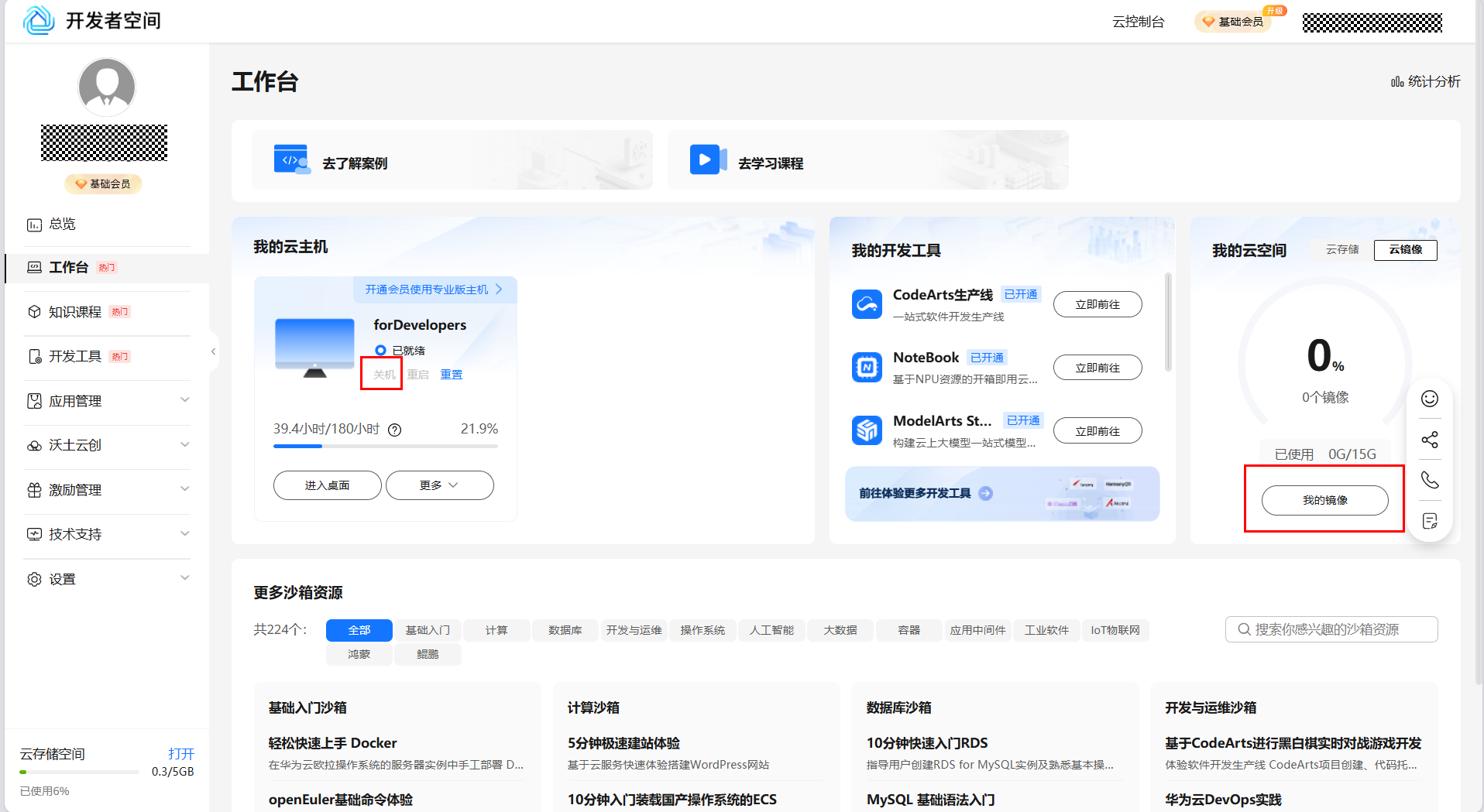 在开发者空间,工作台 – 我的云空间模块,点击我的镜像,进入镜像编辑页面。