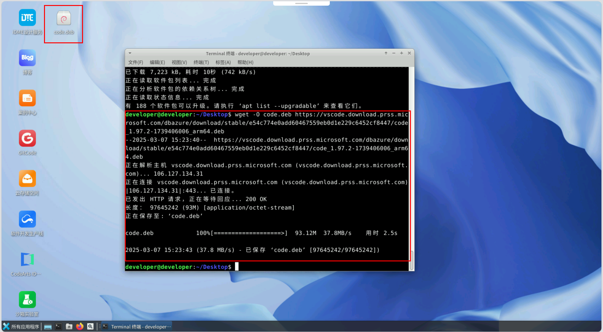 1) 这里使用wget命令下载的deb包会默认下载到当前目录,并且默认命名为code.deb。