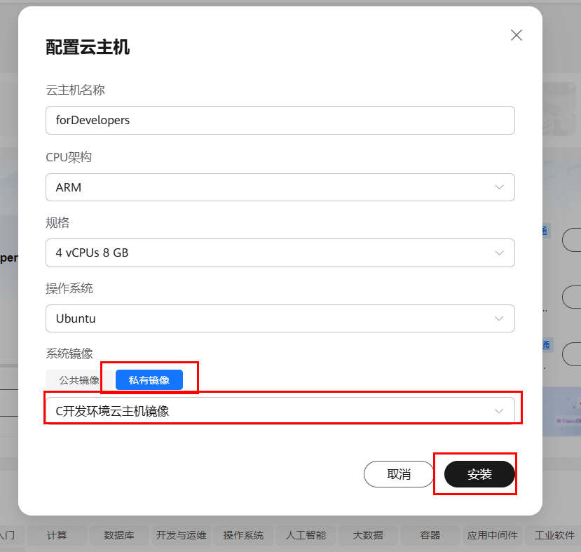 点击配置云主机,选择私有镜像,下拉选项中选择之前已经制作好的镜像,点击安装按钮。进入桌面,自定义镜像开始加载。