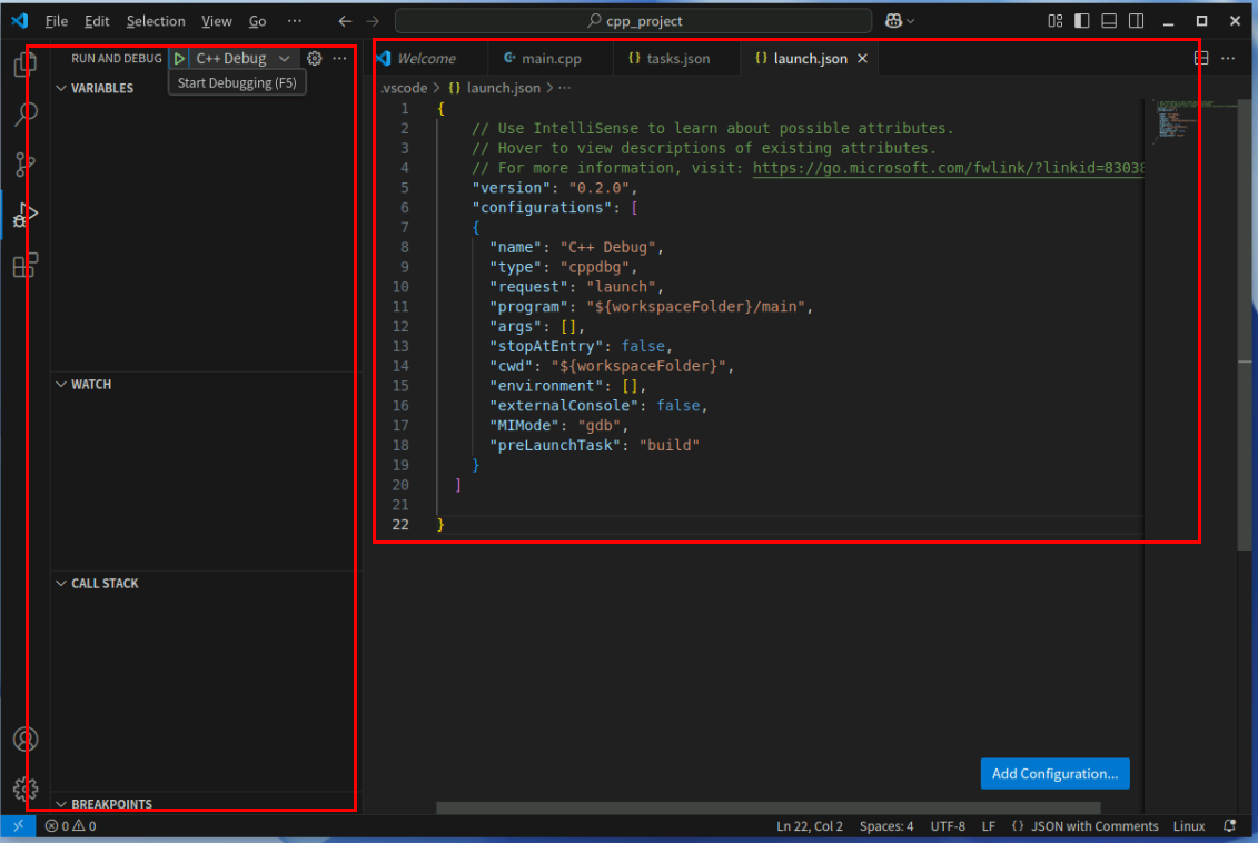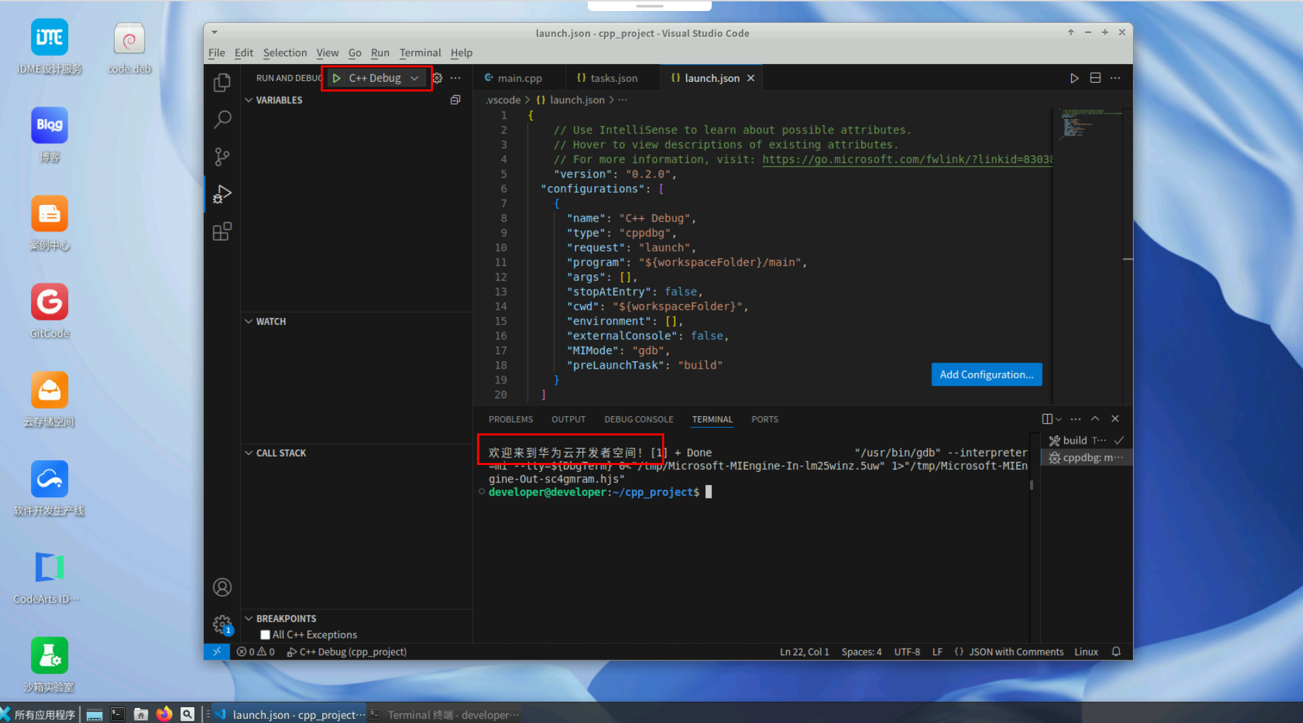 1) 开发者可以通过左上角的C++ Debug按钮启动编译调试。