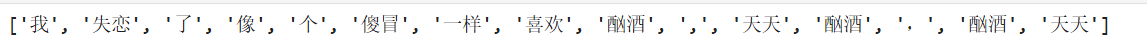 #分词效果 words from snownlp import SnowNLP #待分析的文本 text='我失恋了像个傻冒一样喜欢酗酒,天天酗酒,酗酒天天' #用SnowNLP对text分析 result=SnowNLP(text) #分词 print(result.words) |