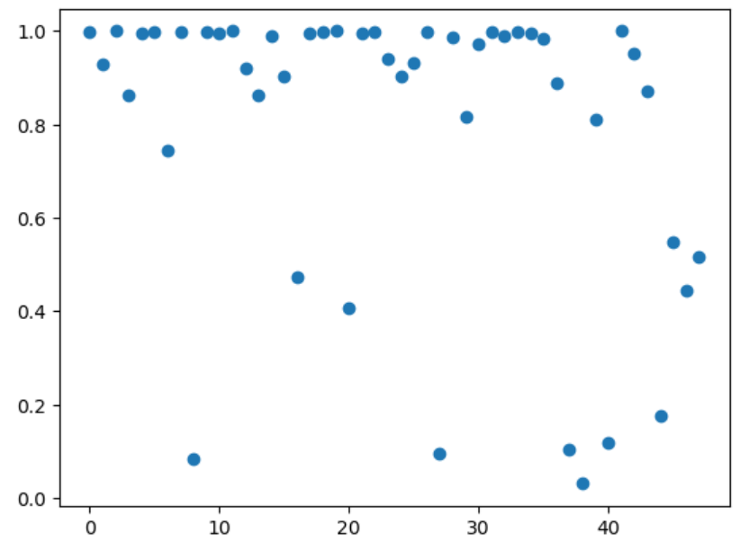 #对某篇小说的情感分析 ; from snownlp import SnowNLP source=open("D:\\Users\\data.txt","r",encoding="utf-8") #逐行读取 line=source.readlines() # print(line) #对文中的每一段文本进行情感分析; senti=[] for i in line: s=SnowNLP(i) #对每一句进行分析 # print(s.sentiments) senti.append(s.sentiments) #客户看到你的这个数字0. 1 ,看不懂抽象的数据-->形象化 import matplotlib.pyplot as plt import numpy as np x=np.array(range(len(senti))) y=np.array(senti) plt.scatter(x,y) plt.show() |