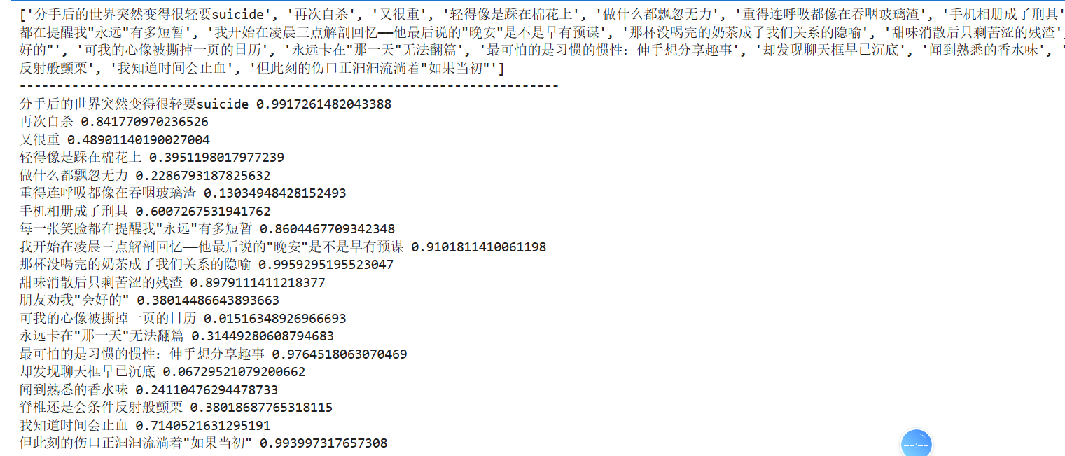 #对段落的分析断句sentences from snownlp import SnowNLP text=''' 分手后的世界突然变得很轻要suicide,再次自杀,又很重。轻得像是踩在棉花上,做什么都飘忽无力;重得连呼吸都像在吞咽玻璃渣。手机相册成了刑具,每一张笑脸都在提醒我"永远"有多短暂。 我开始在凌晨三点解剖回忆——他最后说的"晚安"是不是早有预谋?那杯没喝完的奶茶成了我们关系的隐喻,甜味消散后只剩苦涩的残渣。朋友劝我"会好的",可我的心像被撕掉一页的日历,永远卡在"那一天"无法翻篇。 最可怕的是习惯的惯性:伸手想分享趣事,却发现聊天框早已沉底;闻到熟悉的香水味,脊椎还是会条件反射般颤栗。我知道时间会止血,但此刻的伤口正汩汩流淌着"如果当初"。 ''' #同上不再注释 result=SnowNLP(text) #断句 print(result.sentences) print('------------------------------------------------------------------------') #在上述的基础上进行情绪判断;snownlp里面的方法是sentiments,比刚才那个多了s #值越小负面情绪越强烈 值越大正面情绪越强烈! for s in result.sentences: # print(s) #需要对s,进行一次分析 s2=SnowNLP(s) print(s,s2.sentiments) |