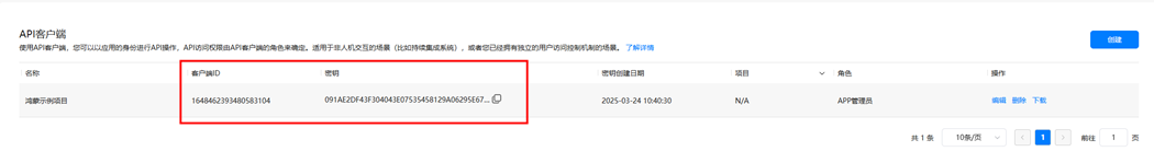 步骤5 API客户端创建完成后,可查看该客户端ID及密钥,此处的客户端ID和密钥将于第4.5章的应用发布中使用。
