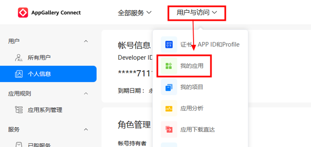 步骤1 在AppGallery Connect官网中,点击顶部菜单“用户与访问-我的应用”。