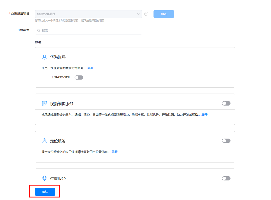步骤5 开放能力可根据实际情况勾选,本实验默认不勾选,点击“确认”。